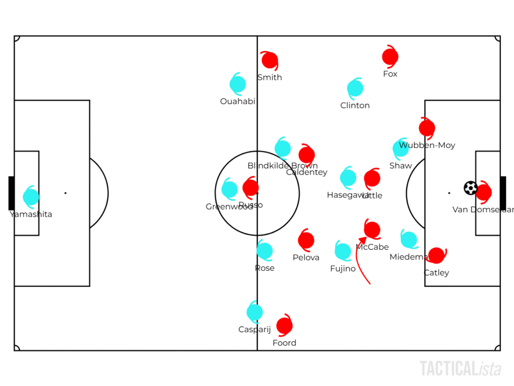 When Arsenal had the ball higher up the pitch, they sometimes formed a back three, with Emily Fox starting a bit deeper from right back, while McCabe pushed into midfield. Victoria Pelova had license to push forward in the left halfspace, or to float centrally, while McCabe’s movement would look to complement hers, either by staying deeper when Pelova was higher, or pushing through the left halfspace when Pelova dropped.