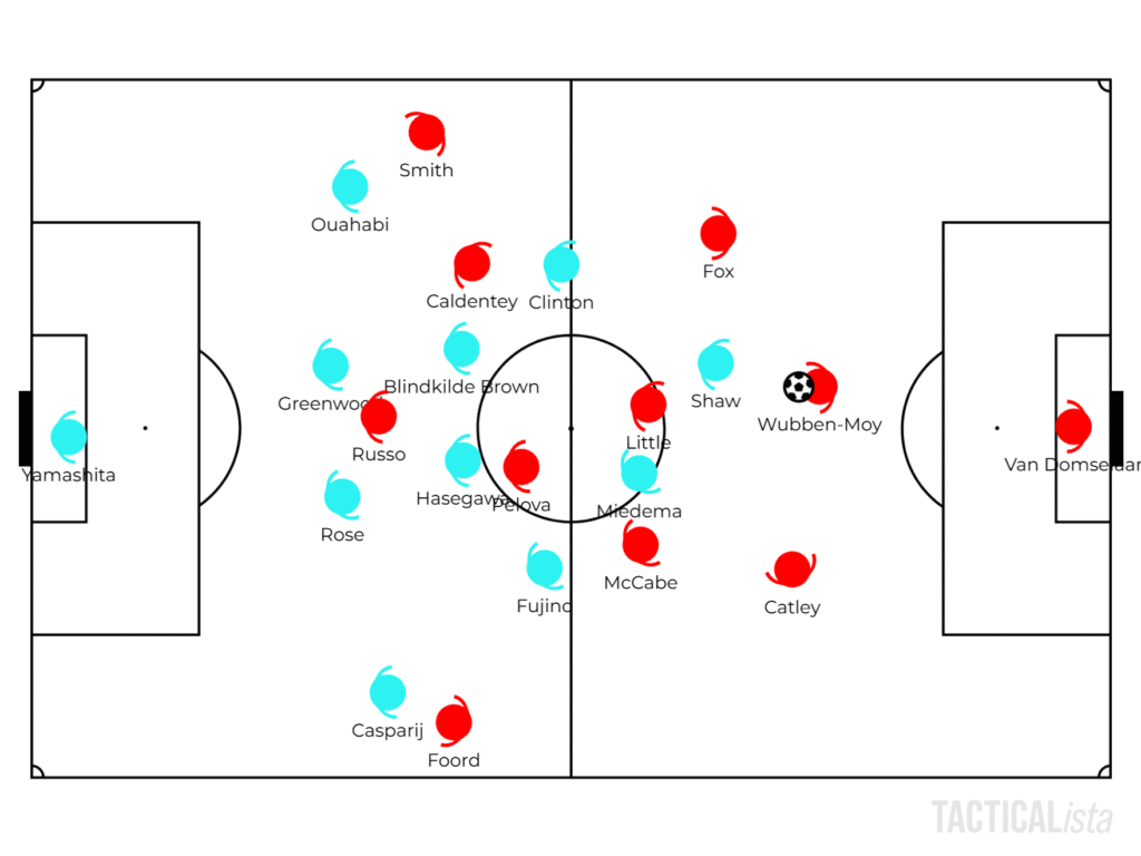 Little usually anchored the Arsenal midfield, while Caldentey frequently drifted across to the right halfspace, between the lines. Fox could also complement the right-sided dynamic from her deeper position by joining attacks, allowing Olivia Smith to focus more on running in behind.