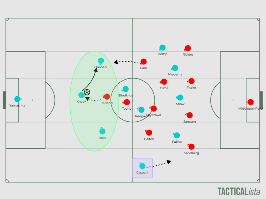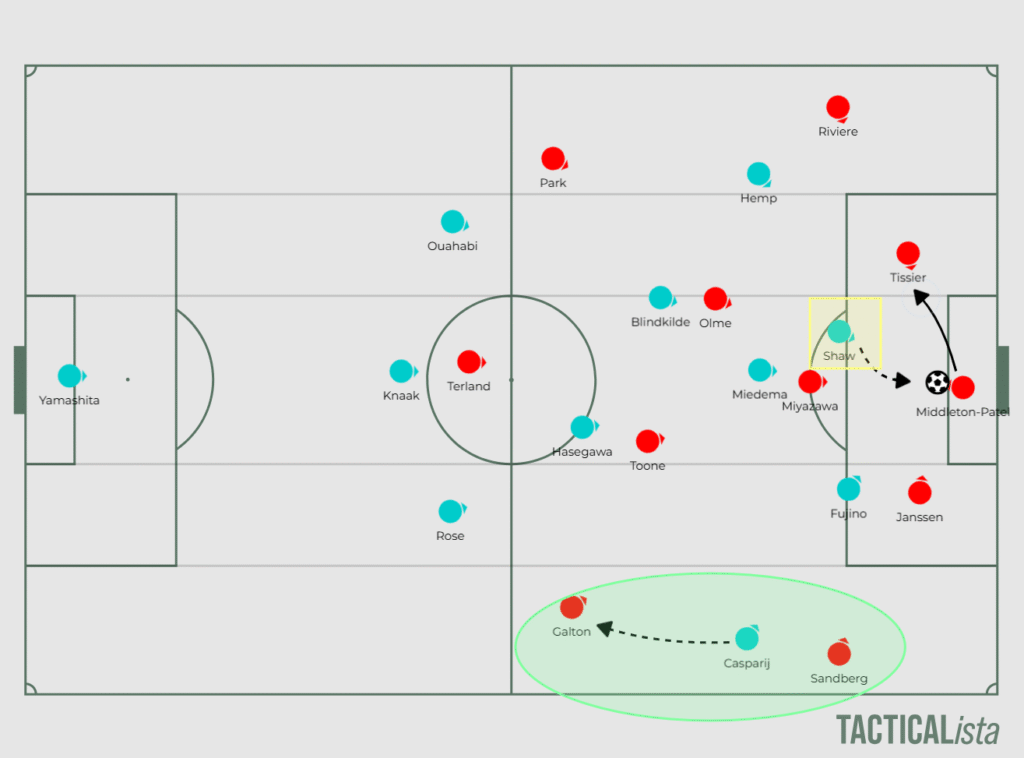 Not only is the cross inch-perfect, but Shaw’s run is really intelligent. She initially positions beside Dominique Janssen before darting on the blindside. The shift in movement was so quick that Maya Le Tissier could not react in time to cover Shaw either.