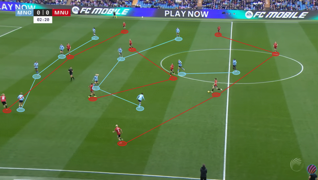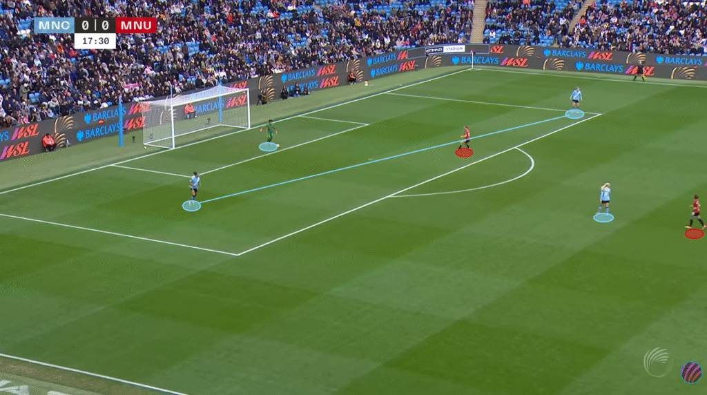 Firstly, it simply locked out one half of the pitch and congested the space available for United to play through. But secondly, and arguably more importantly, it allowed the City right-back, Kerstin Casparij to recover immediately and support the backline – thereby providing a player surplus. This helped the City defenders from facing a 3v3 situation, which could be taken advantage of by United due to the quality of their frontline.