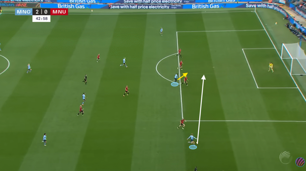 Although City did a good job to generally force United to play down one side before going long or losing possession, there were still some moments where the visitors managed to play through. Either using wide connections or direct attacks, United showed glimpses of their threat in this phase.